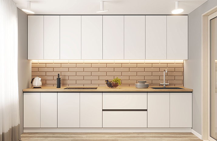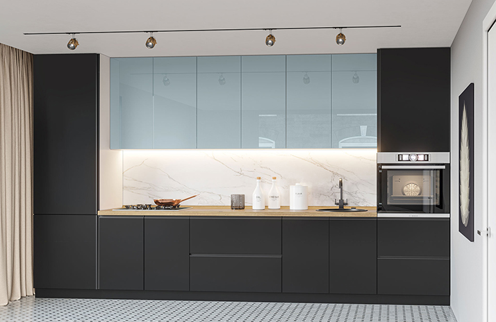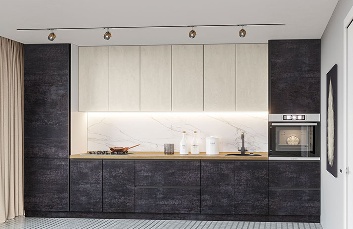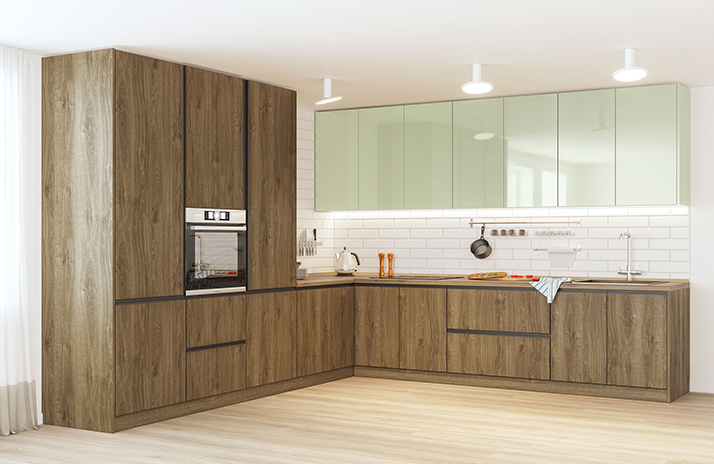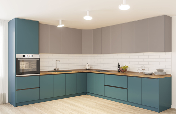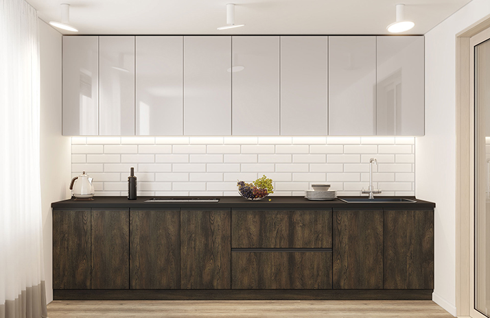 Het materiaal is spaanplaat. Alle frontdelen kunnen worden gelakt met UV-lak. De keuken is uitgerust met een R-56 handgreep, mat zwart, vervaardigd uit kunststof. Het model kan worden uitgerust met een sokkel, lengte naar wens.