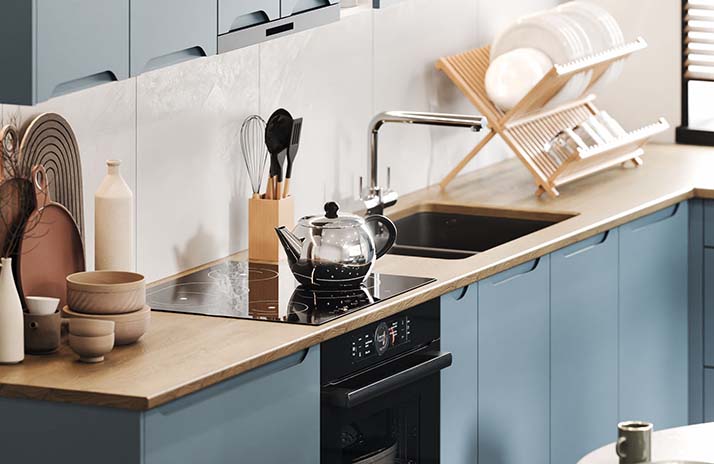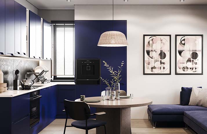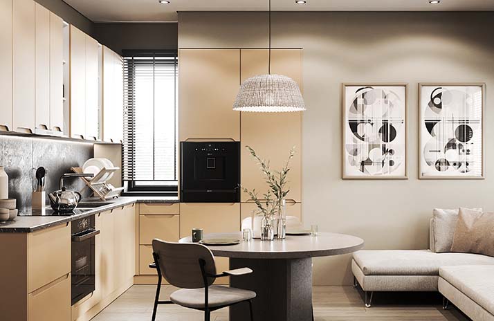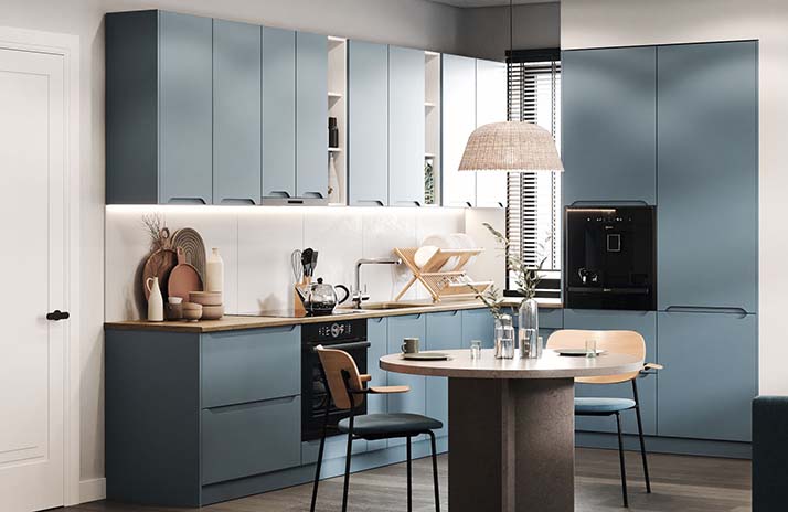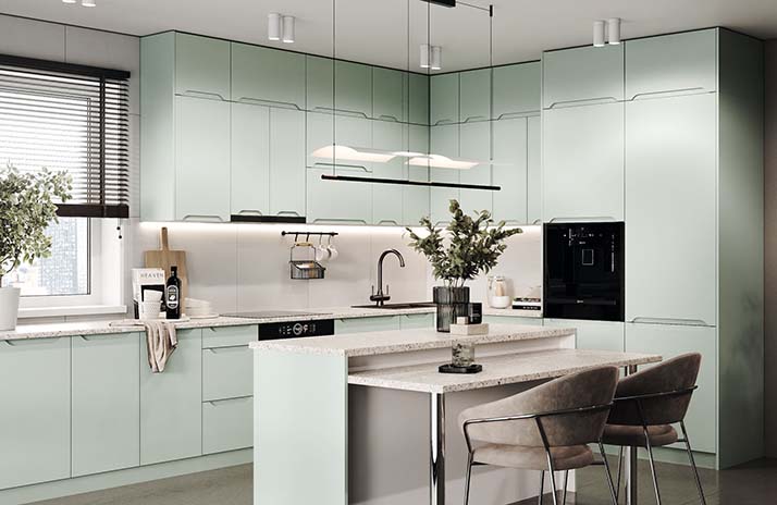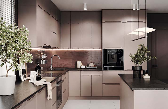 Keukenfronten zijn gemaakt van MDF in de kleuren witte zijde, ijs, ivoor, mocha, latte, grijs fluweel,